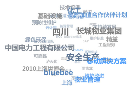 热门关键词:上海、中国电力工程有限公司、中外维护差异、云计算、化工、北京、可持续发展、可靠性、四川、圣戈班、基础设施、安全生产、工程服务、技术培训、施工建设、武汉、汽车、泸天化、流程制造业、深圳、物业管理、电厂、移动解决方案、精益、系统集成、维护改进、维护标准、维护评估、绿色环保、能源管理、长城物业集团、零售业、预防性维护、风险防范、高附加值合作伙伴计划、2010上海世博会、ABB、bluebee®、bluebee®路演、CMMS、bluebee®云计算平台、ROI、SAP、喜科团队、TPM。