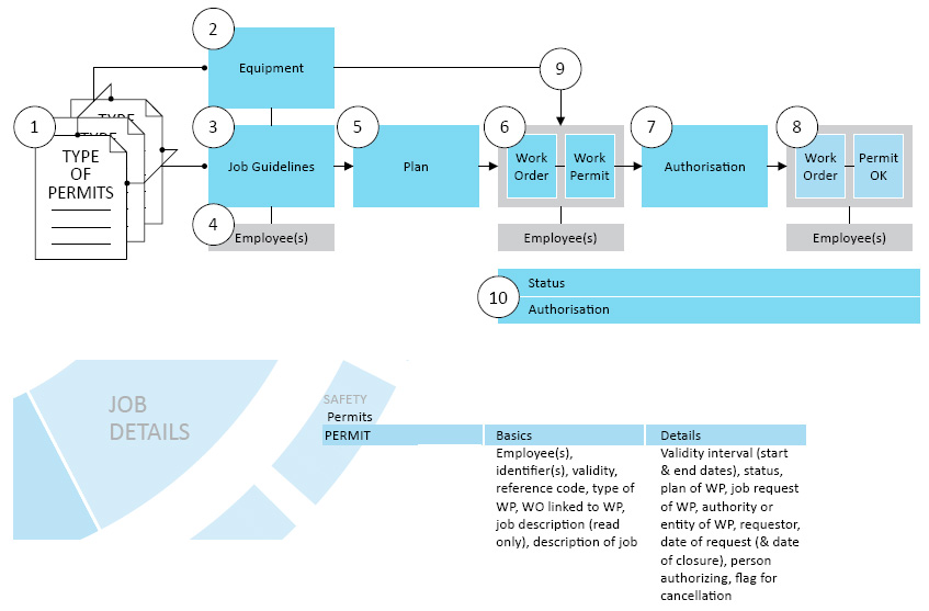 ① A library of Work Permits types (WPs) can be created and …② the permit type assigned to an equipment. Restrictions can be applied, for instance, every time there is an unplanned job on equipment XYZ, a permit must be raised ③ or the permit type can be assigned to a job. In this case whenever that job is to be done to whatever equipment, the constraints of the permit apply ④ employees (either internal or external) are likewise assigned to a job, these employees statuses and authorization will be linked to the WP (see below) ⑤ after a plan has been created and work orders created ⑥ the related work order will generate or raise a WP. Workflow will ensure that authorization for the permit is obtained for each employee ⑦ After the authorization circuit has been respected and all employees on the permit okayed ⑧ the work order can proceed on the specified equipment (or group of equipments) ⑨ In the case of say, an unplanned work order been raised against an equipment that has a permit restriction, the same logic as above applies ⑩ Users can track the status and authorization circuit of a permit at all times. WPs have various statuses such as 0=Raised, 1=not approved, 2=Approved. 3=Closed. The status of the employees and the WP must be logical, for instance, if only some of the employees have been approved but not all, then the status of the WP remains not approved.